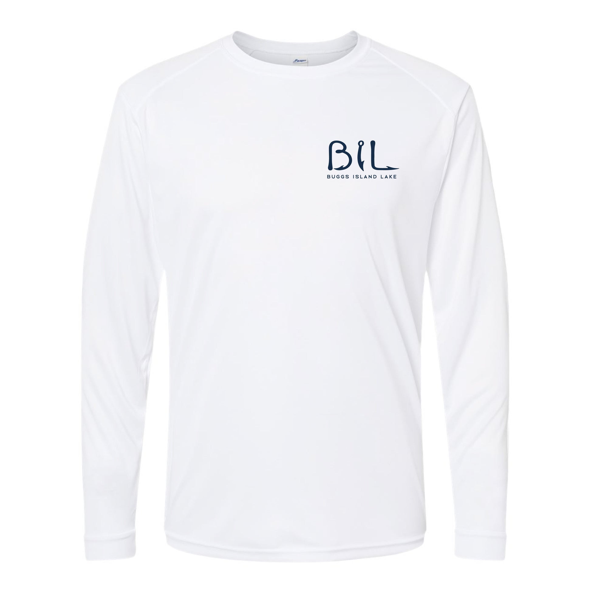 Stay protected and show off your Buggs Island Lake pride with this performance long-sleeve. Featuring our best-selling BIL "Fish Hooks" logo on the front and a bold retro-inspired sunset logo across the back, it captures the laid-back lake vibe in style.